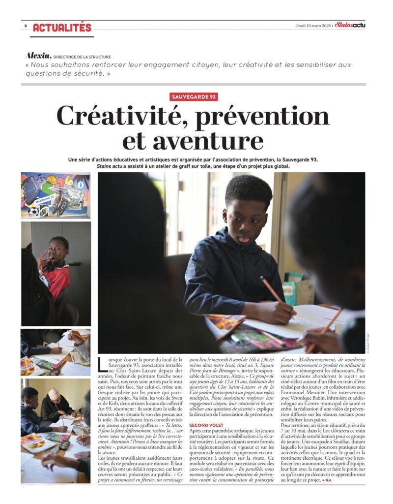 🗞️Stains publie dans son journal de mars, un article sur le travail de l’équipe de prévention spécialisée mettant ainsi en lumière les actions éducatives menées par la Sauvegarde de Seine-Saint-Denis avec les jeunes qu’elle accompagne au quotidien.
